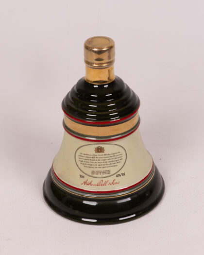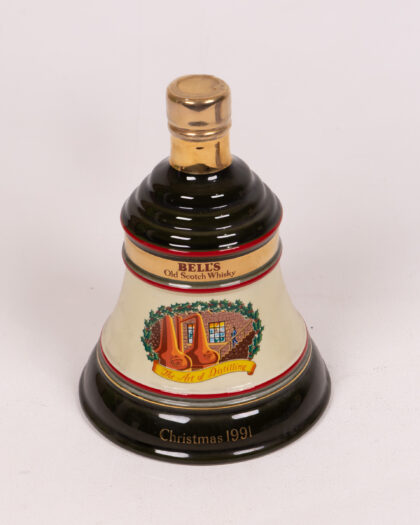 Bell's Old Scotch Whisky Christmas 1991 porcelain decanter in the shape of a bell. The decanter is green with gold accents and has a cream panel featuring a Christmas scene. It is housed in its original tin, also decorated with Christmas themed designs. The tin is green and cream with a paper label on the front. Both decanter and tin show some signs of age and use, with some minor wear to the paintwork on the tin, as per images.