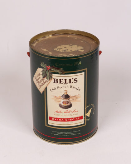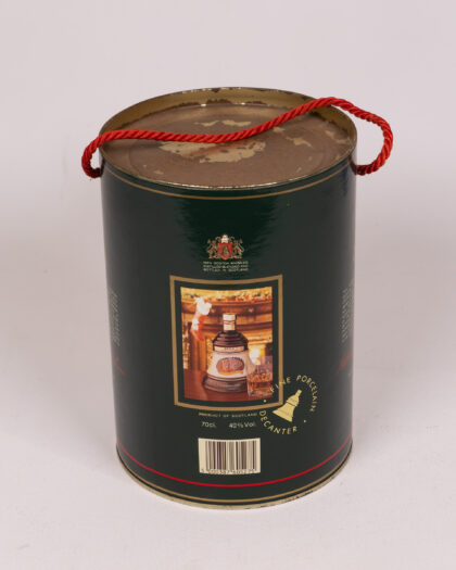 Bell's Old Scotch Whisky Christmas 1991 porcelain decanter in original tin. Festive collectible showing minor signs of age.