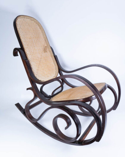 This is a vintage bentwood rocking chair, featuring a dark brown finish and a woven rattan seat and back. The chair's frame is constructed from bent wood, creating a flowing, curvilinear design. The seat and backrest are made of woven rattan, providing a comfortable seating surface. The dark brown finish complements the natural tones of the rattan.