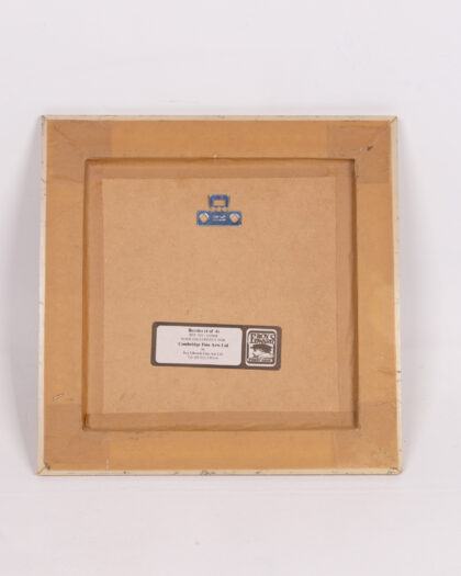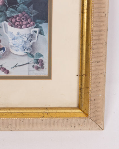 Charming framed print signed 'Galley 1994' featuring a still life of berries arranged in and around teacups. The print showcases vibrant raspberries in a decorative blue and white teacup and a smaller, patterned teacup. The frame is a textured beige with a gold inner border. The print is in good vintage condition, adding to its unique appeal. The back of the frame has information about the print including 'Berries (4 of 4)' and further production details. Perfect for adding a touch of vintage charm to any room.
