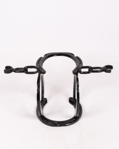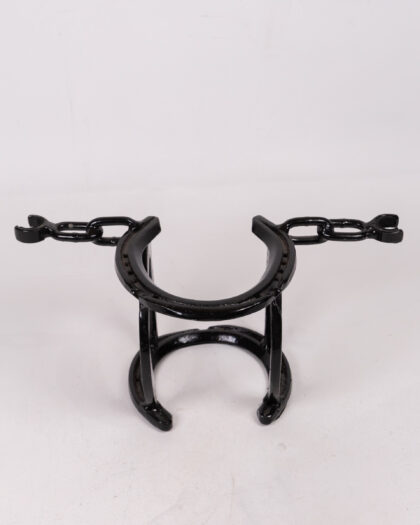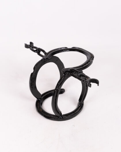 This bespoke bottle holder is crafted from repurposed horseshoes and chain, skillfully welded together and painted black. It features a unique design, providing stable support for a standard-sized wine or spirit bottle. This handcrafted piece showcases rustic charm and equestrian flair, making it a perfect centrepiece or gift for horse lovers. Some minor imperfections due to its hand-forged nature add to its character.