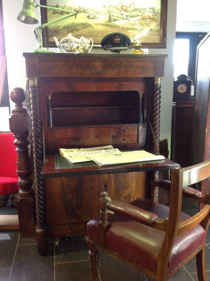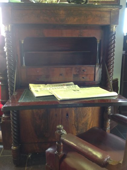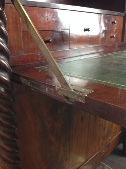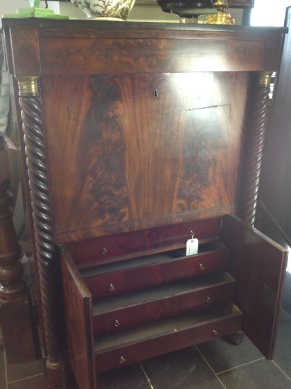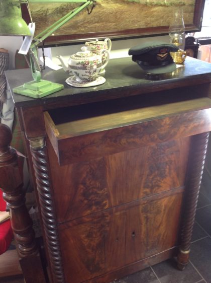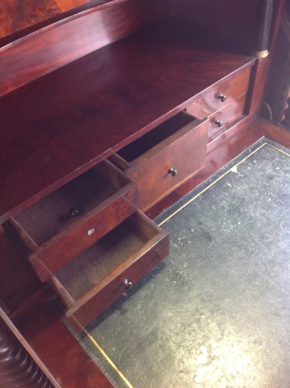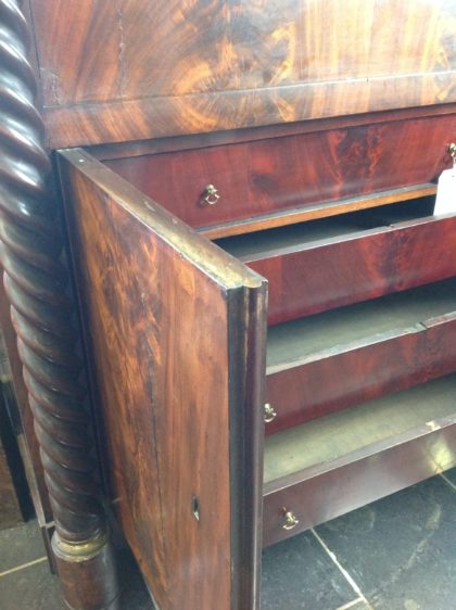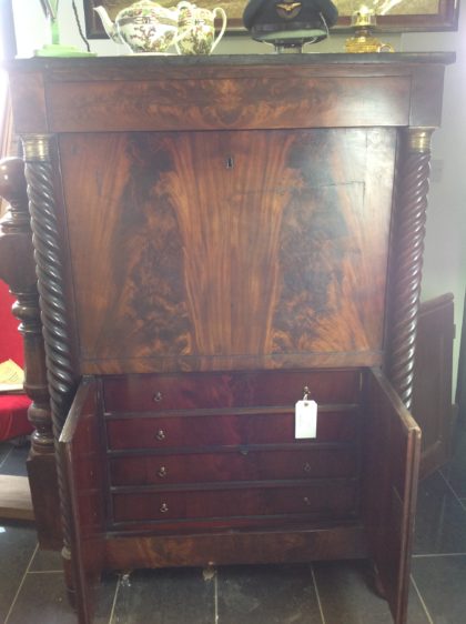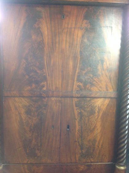 Elegant Biedermeier secretaire desk, circa 1840. Book-matched mahogany veneer, classic design. Ideal for home office or study. Antique charm.