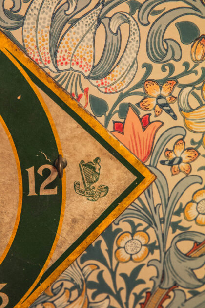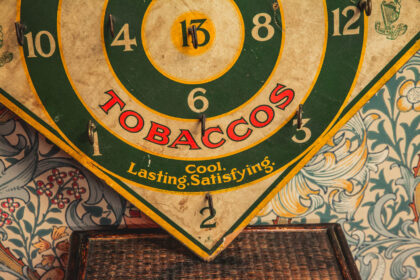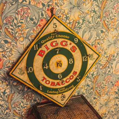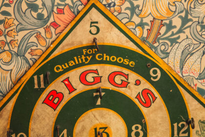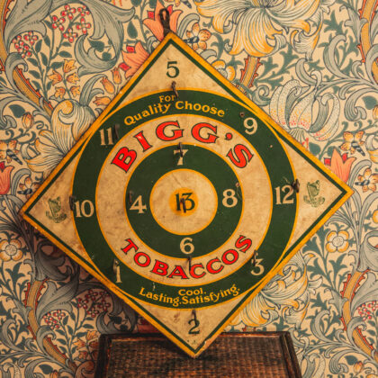 A wooden board with hooks attached for playing a throwing game. Bears lettering which reads, "For Quality Choose Bigg's Tobaccos Cool, Lasting, Satisfying.". Hooks 8 and 9 are missing.