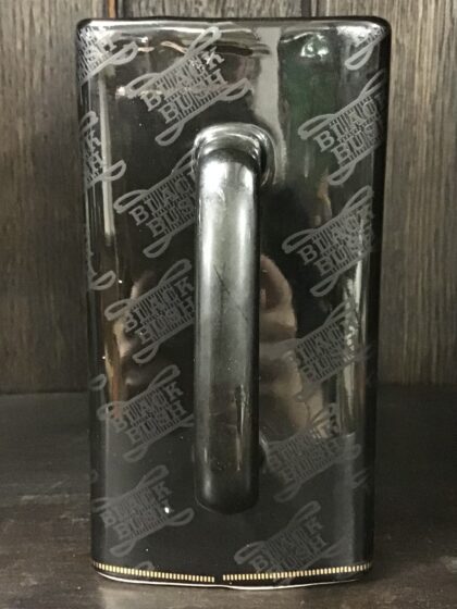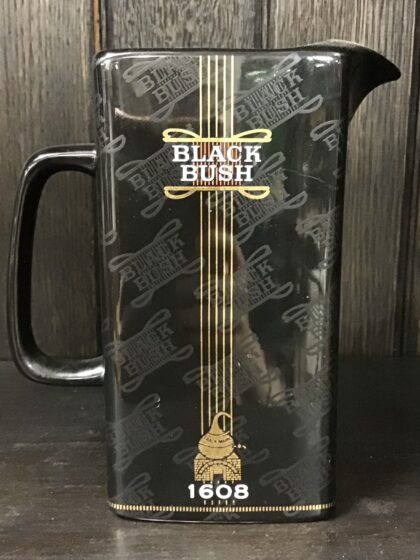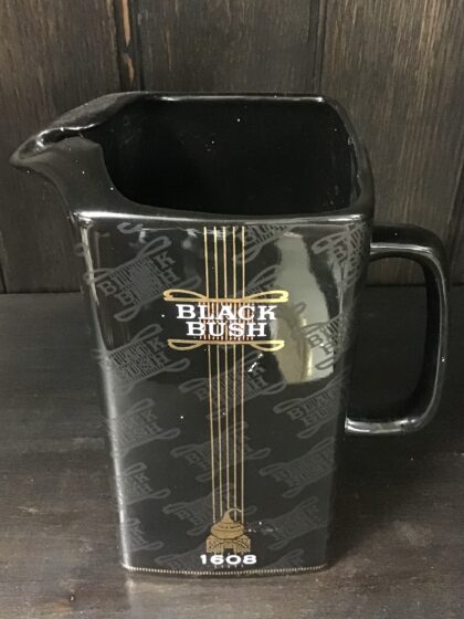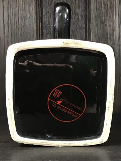 A black glazed ceramic bartop water jug. Bears white lettering and gilt decoration as well as raised black lettering covering the whole jug. Made by Castle Ceramics and bears red backstamp to base.