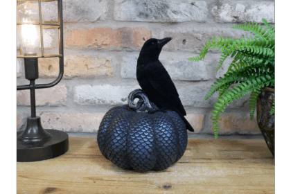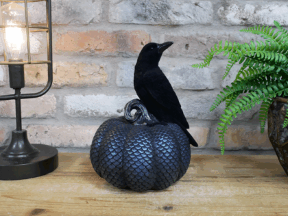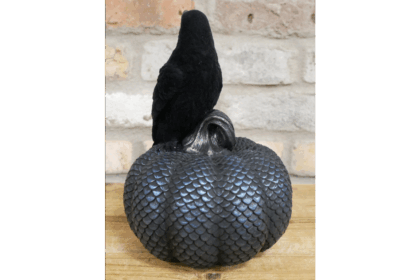A striking decorative ornament featuring a black crow perched on a scale-patterned pumpkin. The crow is made of a velvety-feel plastic, while the pumpkin has a textured, scaly surface in shades of grey. This item would be perfect for adding a touch of Halloween spirit to your home or as part of an autumnal display. Excellent condition, no visible damage.