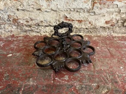 This is a black iron egg holder, featuring twelve circular slots arranged in a flower formation. A decorative floral pattern is visible underneath each egg slot. The egg holder has a practical and decorative handle.