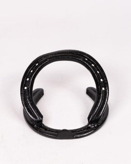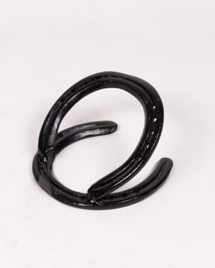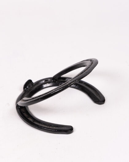 A unique black metal horseshoe phone/tablet stand. This piece features two horseshoes, one forming the base and the other arching over to hold a device. It's a quirky and functional item, perfect for adding a touch of rustic charm to your dining table. In good condition.