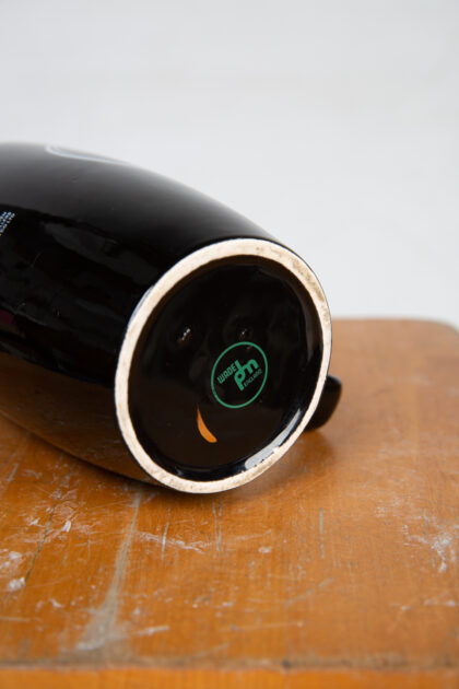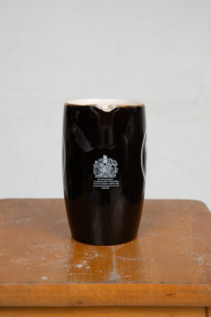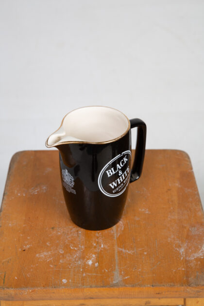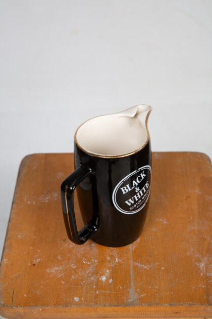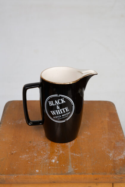 A black ceramic glazed bartop water jug. Bears white lettering which reads, "Black & White Scotch Whisky Buchanans". Made by Wade and features green backstamp to base.