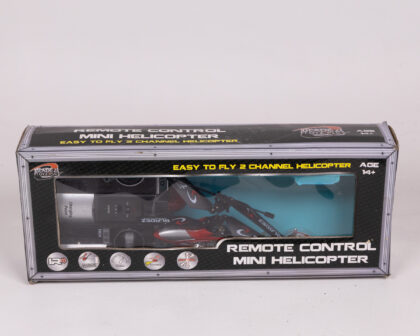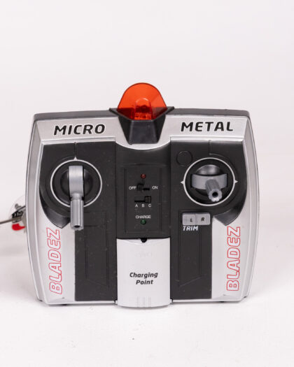 This is a Bladez Micro Metal remote control helicopter toy. It comes with a remote control and features a black, red and silver colour scheme. The box indicates it is suitable for ages 14+. A fun toy for older children and adults. Good condition.