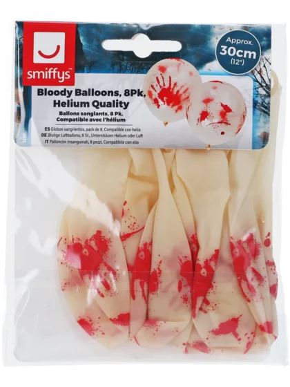 Add a spooky touch to your Halloween decorations with these Smiffys Bloody Balloons. This pack includes 8 high-quality, 30cm balloons that are suitable for helium inflation. Featuring a white base with realistic-looking blood splatter and handprints, these balloons will create a chilling atmosphere at any Halloween party or haunted house. Easy to inflate and display, perfect for indoor or outdoor use.
