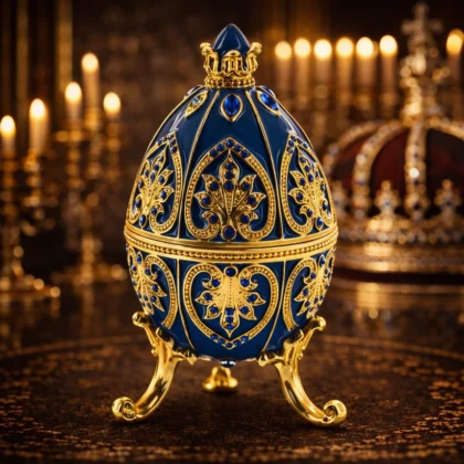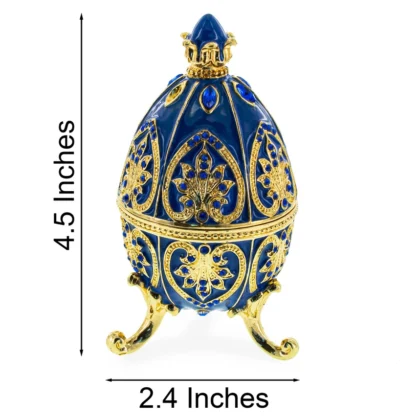 This brand new egg-shaped trinket box boasts intricate gold detailing and vibrant blue enamel. The egg is hand painted & decorated with elaborate gold-tone filigree, set with sparkling blue Austrian crystals. It opens in the middle to reveal a small storage compartment. The egg sits upon three ornate gold-coloured legs. The egg is perfect for storing small trinkets or jewellery, or simply as a decorative ornament. It would look beautiful displayed on a mantelpiece, shelf, or dressing table.