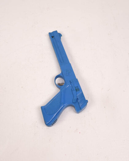 This is a vintage plastic toy gun, moulded in a bright blue plastic with details to mimic a Colt-style pistol. The design incorporates a faux barrel, trigger, and textured grip. The body features moulded details including a horse emblem. The toy is made from lightweight plastic. It shows some surface wear from play, including minor scratches and scuffs, consistent with age. This plastic toy gun would make a fun addition to a child's toy collection.