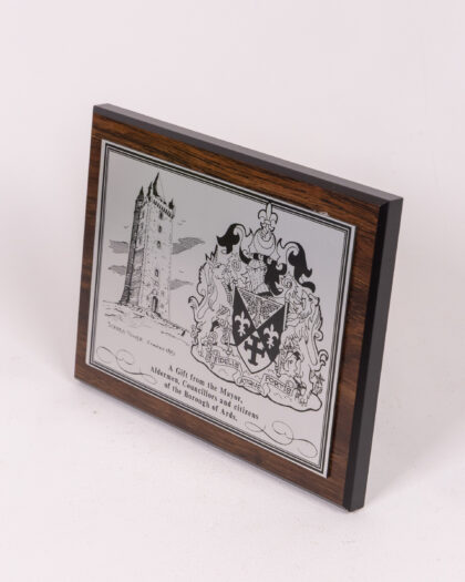 This is a Borough of Ards presentation plaque made from wood with a silver-coloured metal insert. It features an image of Scrabo Tower along with the Borough of Ards coat of arms. The inscription reads: 'A gift from the Mayor, Aldermen, Councillors and citizens of the Borough of Ards'. This is a piece of Northern Irish local history. In good condition. Would make a perfect gift for anyone from the local area.