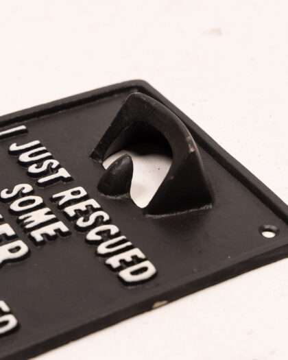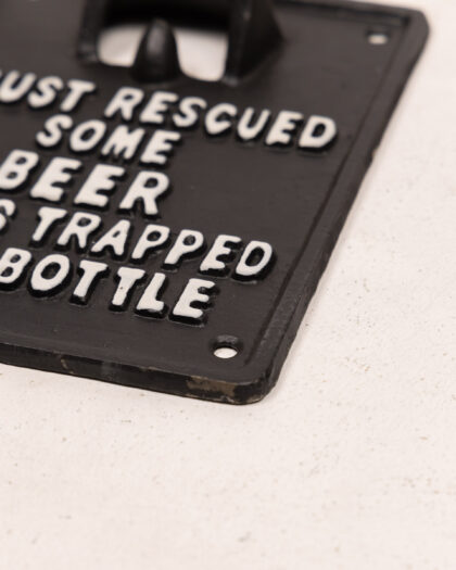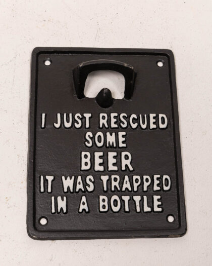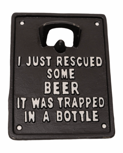Add a touch of humour to your bar area with this cast iron bottle opener plaque. Featuring the witty phrase 'I Just Rescued Some Beer, It Was Trapped In A Bottle', it combines functionality with charm. Perfect for beer enthusiasts. Dimensions: H: 17cm, W: 13cm, D: 3cm. Weight: 0.48kgs.