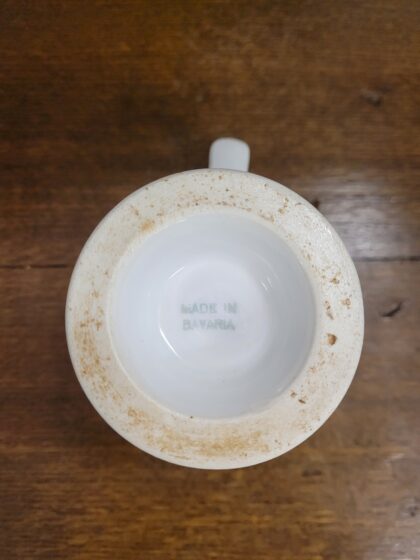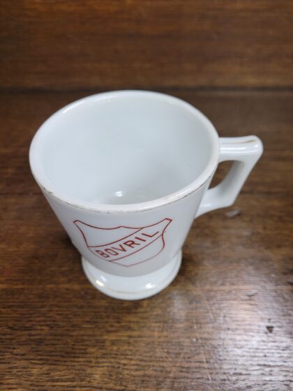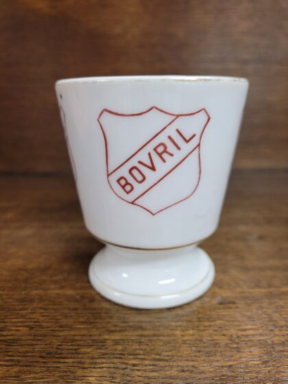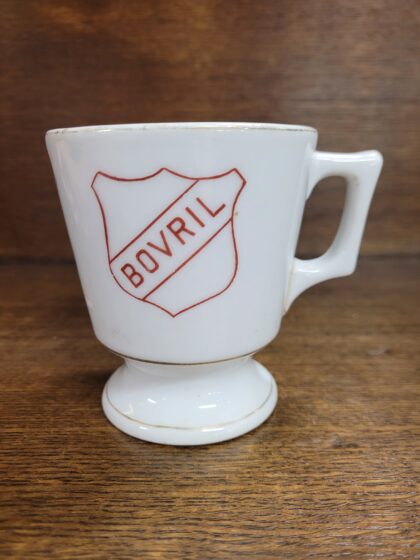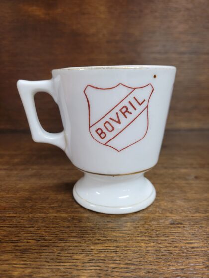 A white glazed ceramic teacup. Bears the Bovril logo in red three times and features gilt decoration. Bears lettering to base which reads, "Made in Bavaria".