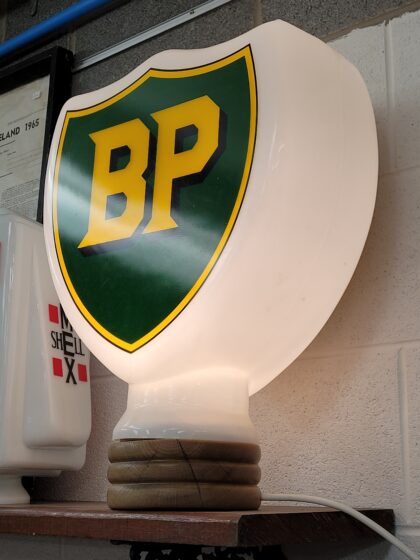 A milk glass globe from a petrol pump, "BP" brand and in the shape of a shield. Can be placed on a wooden base (shown in photos) which turns it into a lamp; base sold separately and is £75.