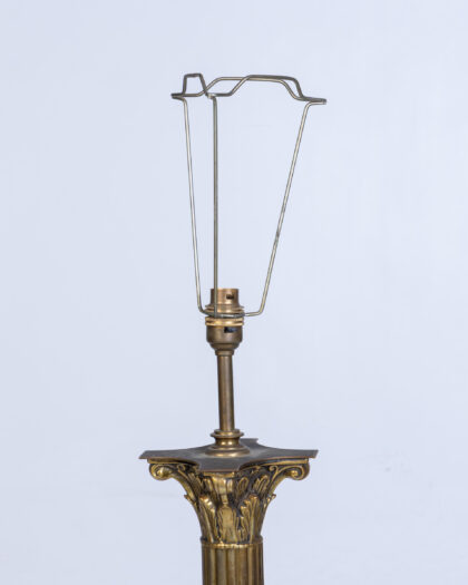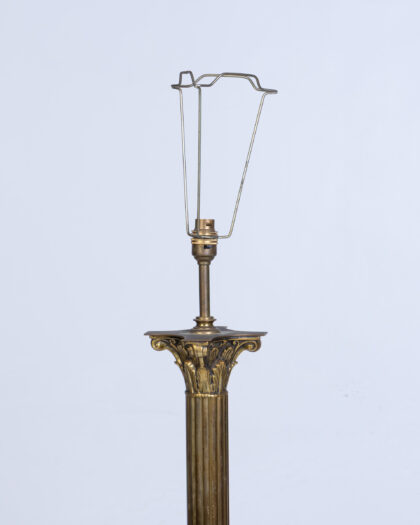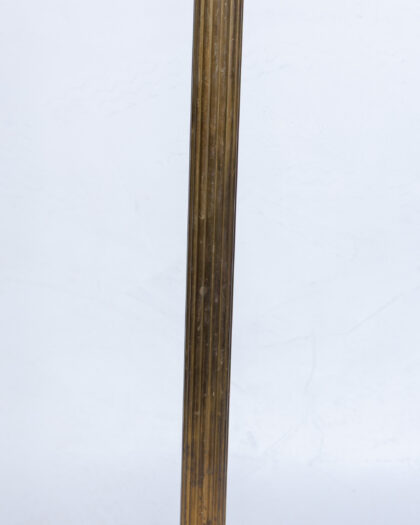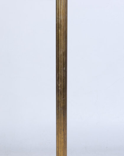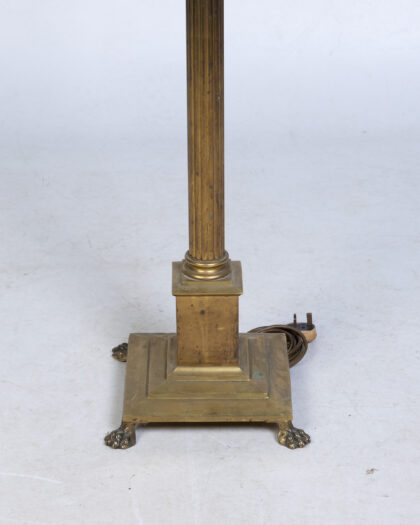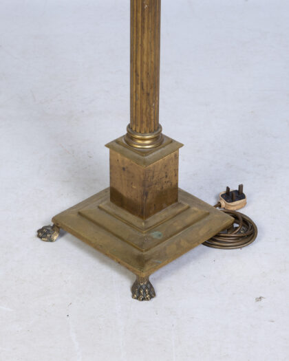This floor lamp features a fluted column design, reminiscent of classical architecture. The lamp has a square base with ornate paw feet, adding to its elegant look. The aged brass finish gives it a timeless appeal. Please note that this is a vintage item and may show signs of wear consistent with its age. It is fitted with a modern UK plug.