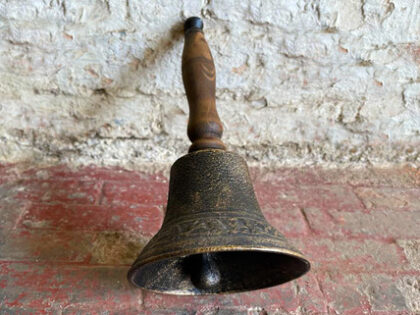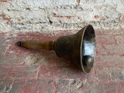 This traditionally styled hand bell has a brass finish and a beautifully turned wooden handle. The bell itself boasts embossed detailing around the bottom edge. Ideal for rural, farming or countryside environments, imagine this hand-bell living on a farmhouse window sill, waiting to be rung to call the family in for their tea! This item would display well in a living room or kitchen.