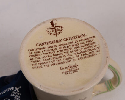 Vintage Brentleigh Ware Staffordshire England ceramic mug with Canterbury Cathedral image and City of Canterbury crest. Good condition.