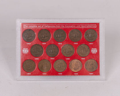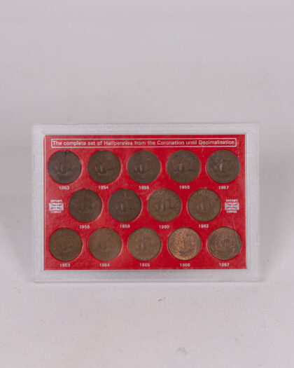 Complete set of Britannia halfpennies from the coronation until decimalisation, spanning the years 1853 to 1967. The coins are displayed in a protective plastic case with a red insert. The coins show wear and age appropriate to their circulation. A great starter collection piece.