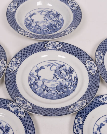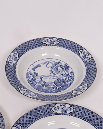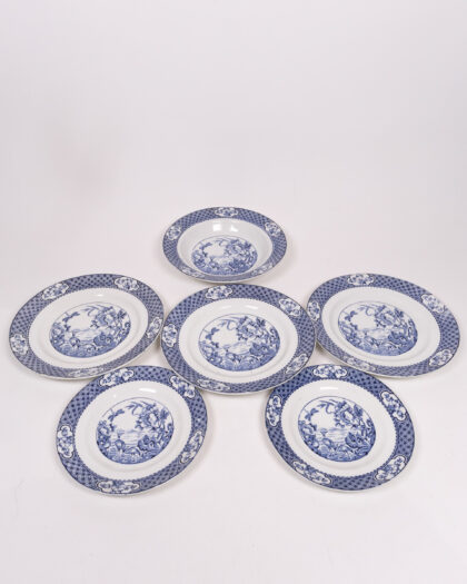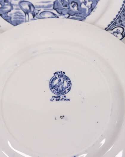 This is a set of six Britannia Pottery plates. Five of the plates are dinner plates and one is a bowl. Each plate is decorated with a detailed blue and white scene featuring birds, flowers, and a landscape. The borders of the plates feature a geometric pattern with floral accents. Marked on the bottom of the plates Britannia Pottery Co. Glasgow. Ideal for collectors or anyone looking to add a vintage touch to their dining set. They are in good vintage condition.