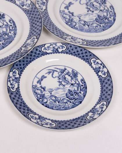 Set of vintage Britannia Pottery plates featuring a blue and white scenic design. Good condition, perfect for display or light use.