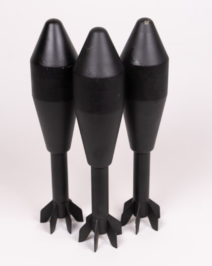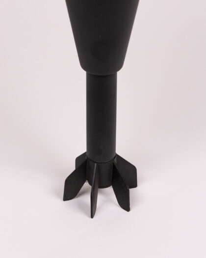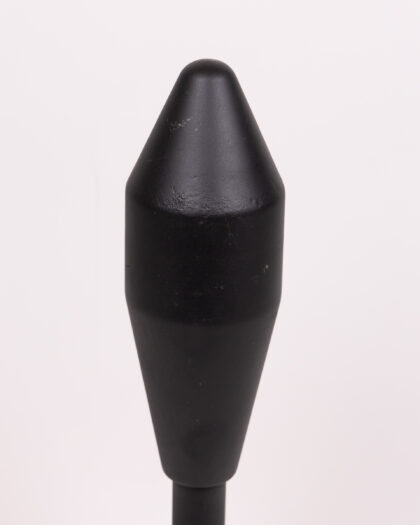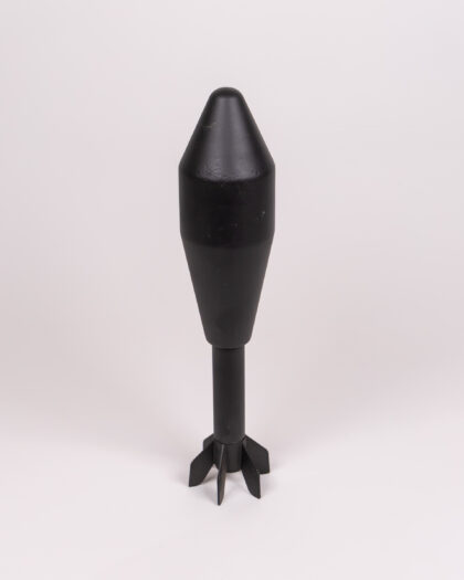 A black NR5 Energa rifle grenade. The NR5 Energa is a rifle grenade designed for use by the armed forces. It has a distinctive shape, with a warhead that is designed to penetrate armour and fortifications. The grenade is constructed from metal with stabilizing fins at the tail. The overall condition is good. This grenade would make a unique addition to any collection of military memorabilia.