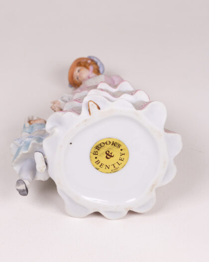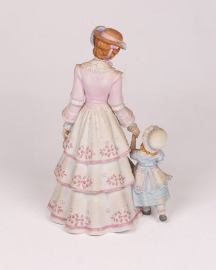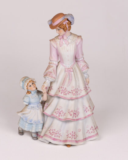 Elegant Brooks & Bentley figurine depicting a Victorian lady holding the hand of a young child. This porcelain ornament features exquisite detail in the mother's pink and white layered dress with subtle floral decoration. The young girl wears a complementary blue dress. Marked on the base with the Brooks & Bentley stamp. This lovely piece would make a wonderful addition to a collection.