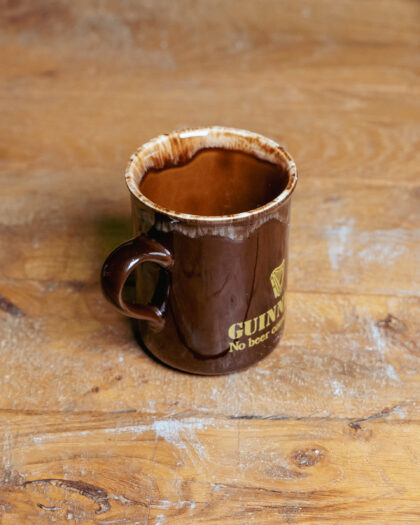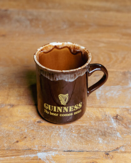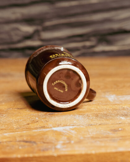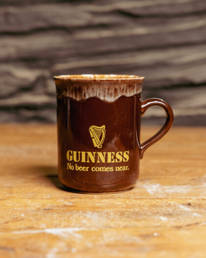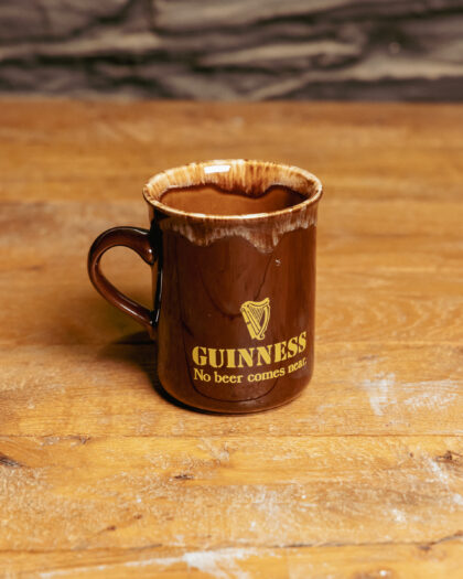 A brown mug with yellow lettering which reads, "Guinness No beer comes near". Made by Carrigdhoun Ireland and bears yellow backstamp to base.