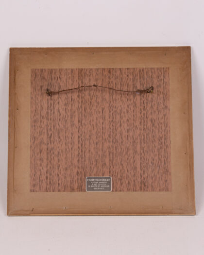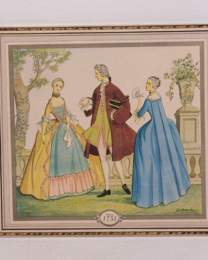 This is a vintage framed print depicting figures in 18th-century clothing in France. The print is signed 'Buckmaster'. The print is of people from 1751. The frame is painted with a decorative gold trim around the inside edge, it has a glass front to protect the print. The back of the frame has a label from F.G. Davis & Sons Ltd, Picture Framers, 15 Royal Avenue, Belfast.