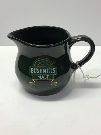 A green glazed bartop water jug. Bears white lettering which reads, "From the World's Oldest Whiskey Distillery Original Grant to Distil 1608 Bushmills Malt".