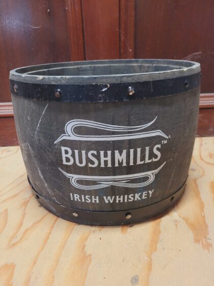 A black wooden circular ice bucket in the form of a barrel. Bears white lettering which reads, "Bushmills Irish Whiskey".