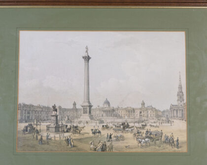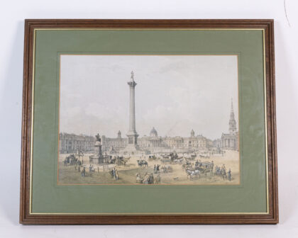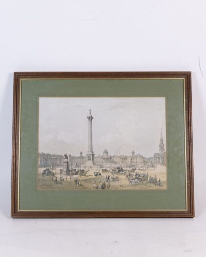 Framed print depicting Nelsons Column in Trafalgar Square, London. The print is set within a brown wooden frame and a green mount. The print captures a detailed view of Trafalgar Square with its iconic column and surrounding buildings. The artwork has an aged appearance which suggests it could be a vintage print. This piece would make a great addition to any home. In good condition.