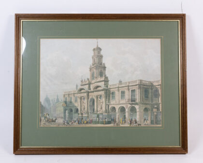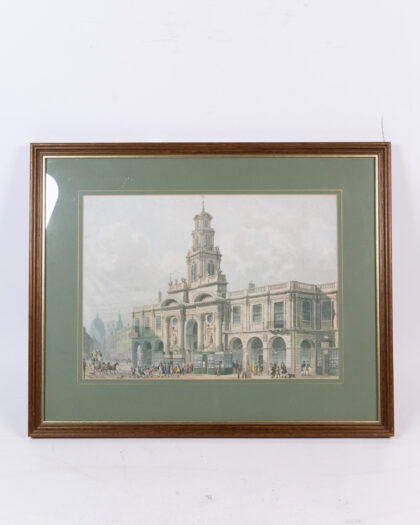 Vintage framed print of the Royal Exchange, London. Features a wood frame and green border. Ready to hang. Great decor for any room!