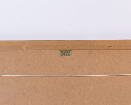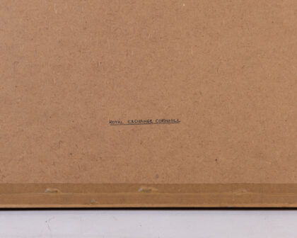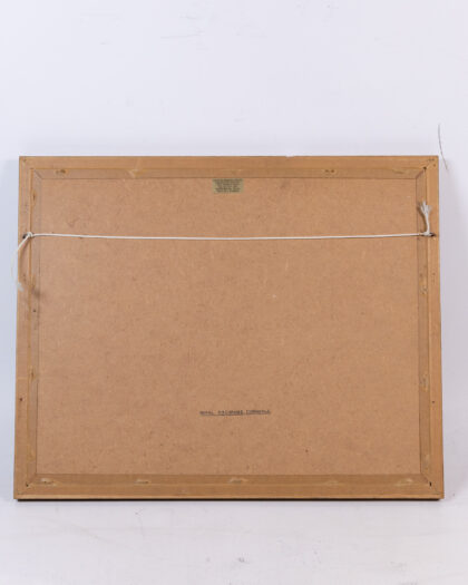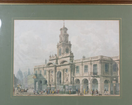 A vintage framed print of the Royal Exchange in London. The print is in good condition and features a wooden frame with a green inner border. The print depicts the Royal Exchange building with people and horse-drawn carriages in front. The print is in good condition with minimal signs of wear. The backing of the frame has a sticker for "Corners Trading Service and Picture Gallery" in Belfast. The frame is strung with cord, ready to hang.