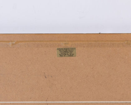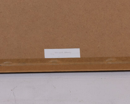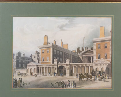 This is a framed print featuring a detailed depiction of the Admiralty building in London, England. The print showcases the architectural style of the Admiralty, with its grand facade, colonnades, and surrounding urban landscape. The scene includes horse-drawn carriages, figures in period attire, and other details that provide a glimpse into the historical setting. The print is mounted in a green mat and framed in a dark brown wooden frame. The frame has a simple design that complements the artwork. The backing of the frame shows some wear and has a label indicating that it was framed by Corners Framing Service in Belfast. The condition of the print appears to be good. It's a great piece for collectors of historical prints or those with an interest in London's architectural history.