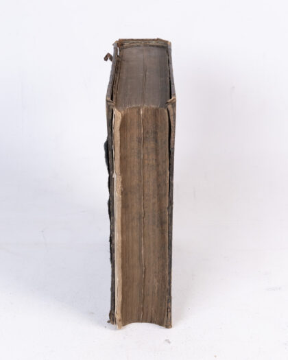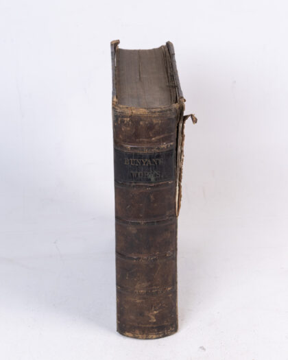This is an antique 1880s edition of "The Pilgrim's Progress" and other works by John Bunyan. Published by William Mackenzie, London, Glasgow and Edinburgh. The book features a leather-bound spine and corners, with the rest of the cover in a dark, possibly coated, paper. The title "Bunyan's Works" is printed on the spine. The book is in fair condition for its age, with wear and tear to the cover, including scuffs and damage to the spine and corners. The pages show foxing and age-related discolouration.