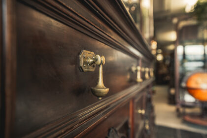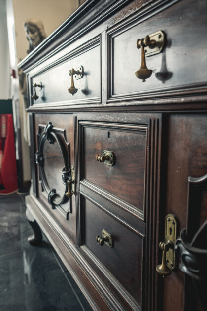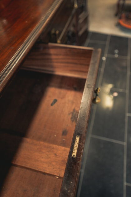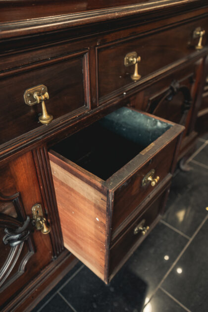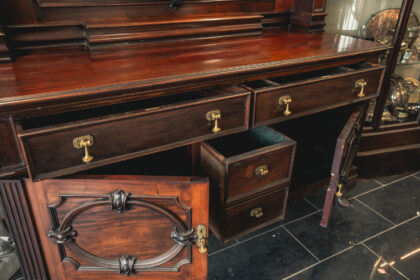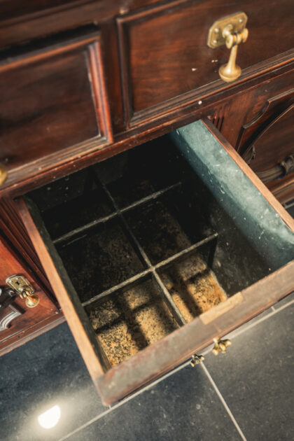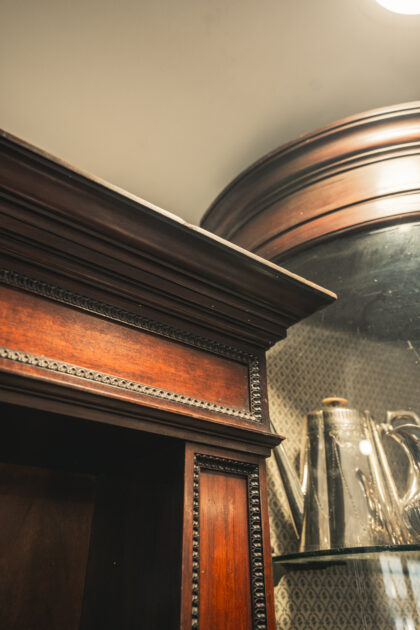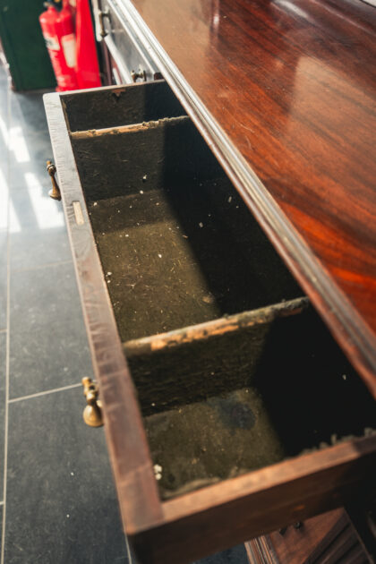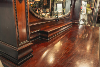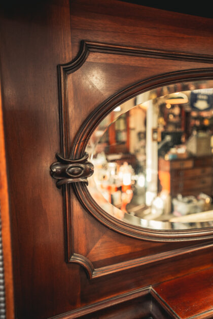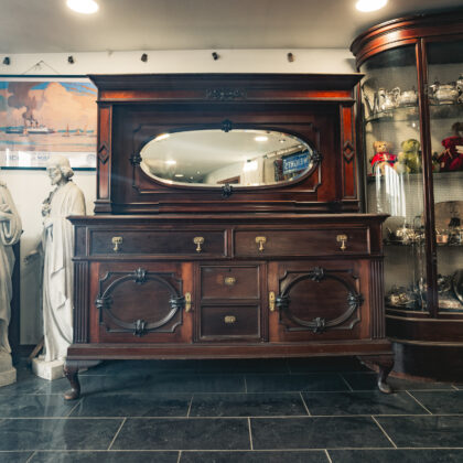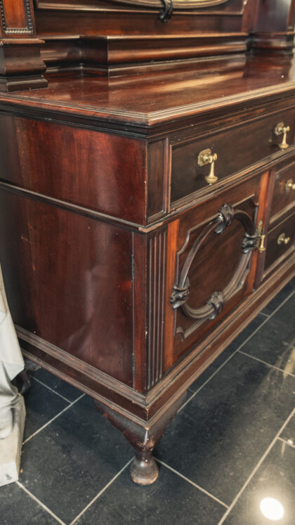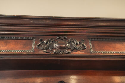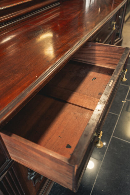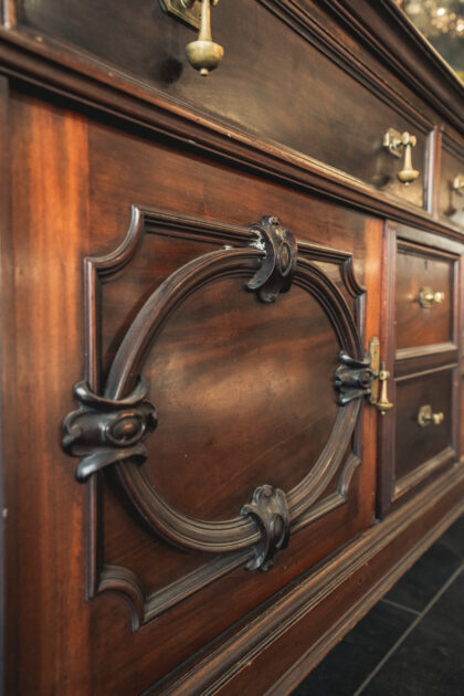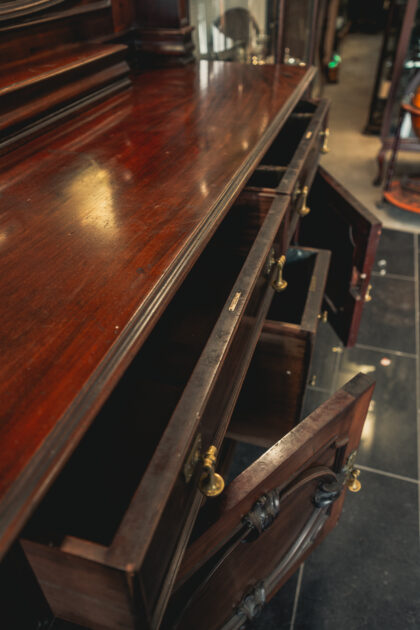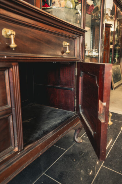 A late Victorian/early Edwardian substantial piece of furniture that includes a central bottle-cooler. A very impressive piece of furniture in functional condition with teardrop handles and original bevelled glass.