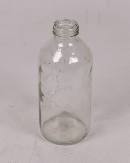 Clear glass bottle with clear volumetric graduations marked on the side. This is an ideal bottle for storage in a vintage or modern setting. It will suit many decor styles and situations. A great addition to any collection. A great retro look, and still ideal for use for small vase, milk decanter, drinks bottle, etc, etc. Strong glass bottle with millilitre increments 100ml to 500ml upright and upside-down, as per photographs. Indented circumference near bottom of bottle to house inversion band for a drip. Screw moulding on top to accept lid.
