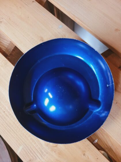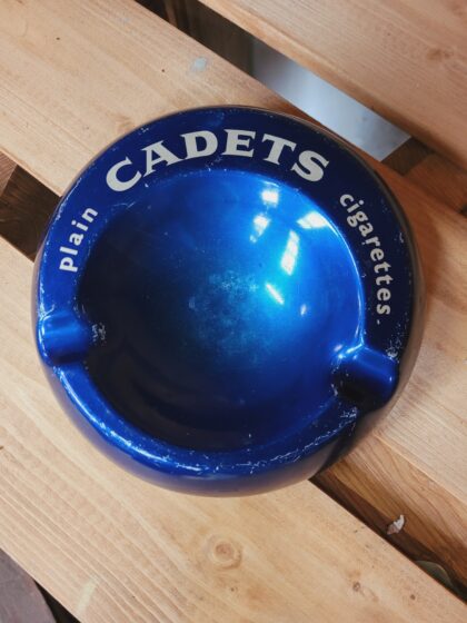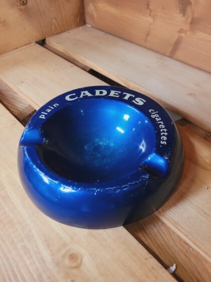 A circular blue tin ashtray. Bears white lettering which reads, "Plain Cadets Cigarettes".
