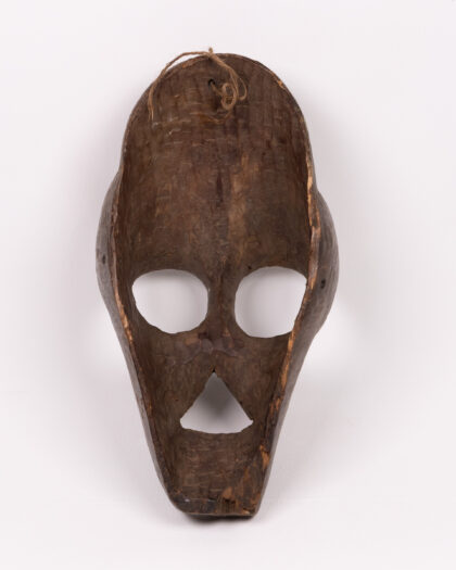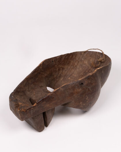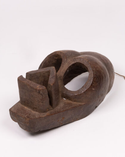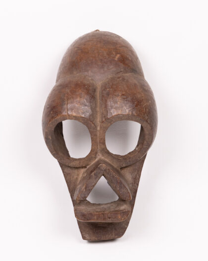 This striking Cameroon Skull Mask, a wood mask features hand-carved details and a rich, dark brown finish. The mask has distinct facial features, including large eye holes and a prominent nose. The wood has a rustic, aged appearance. Perfect for adding a touch of tribal art to your home decor. No damage, minor wear consistent with age. Ready to hang.