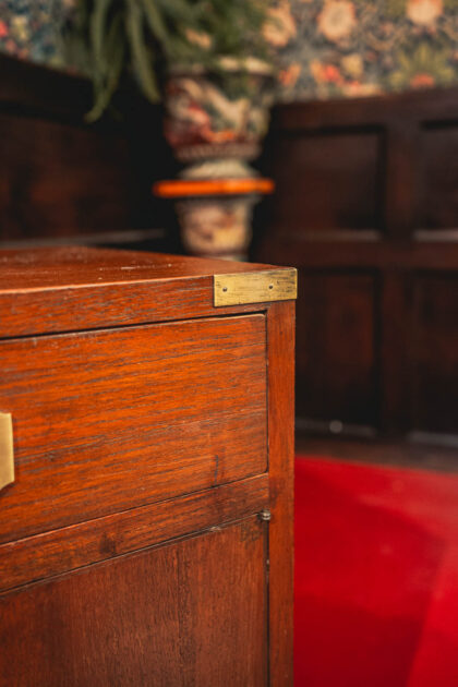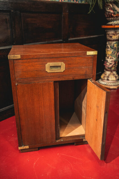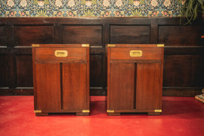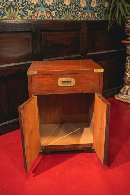 A pair of teak mid 1900s bedside lockers in campaign style. A good size with ample bedside storage and brass hardware.