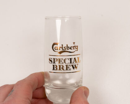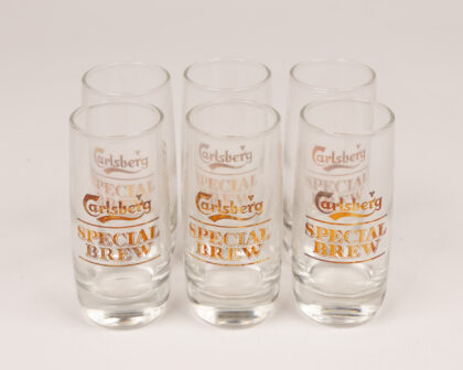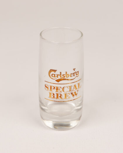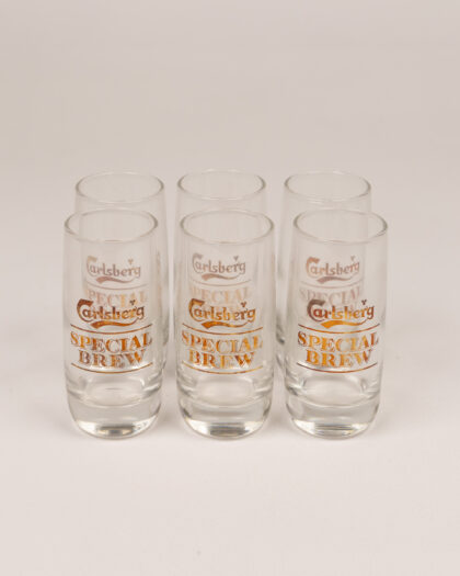 This is a set of six Carlsberg Special Brew shot glasses. Each glass features the Carlsberg logo and "Special Brew" printed in gold lettering. The glasses are in excellent condition, showing minimal signs of wear. They come in original box. A perfect addition to any home bar or collection of breweriana. Ideal for serving shots or for display.
