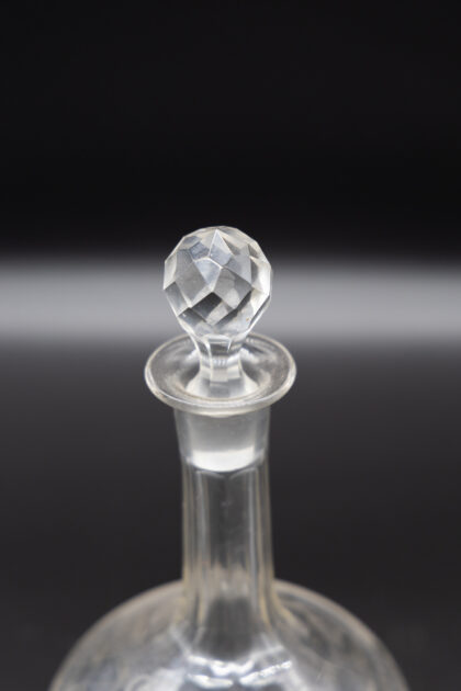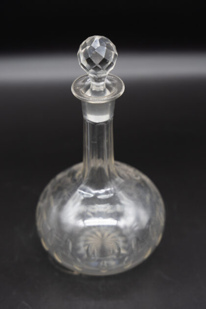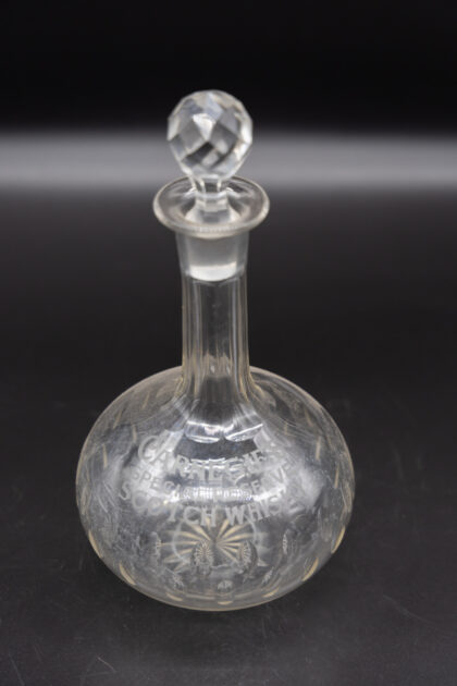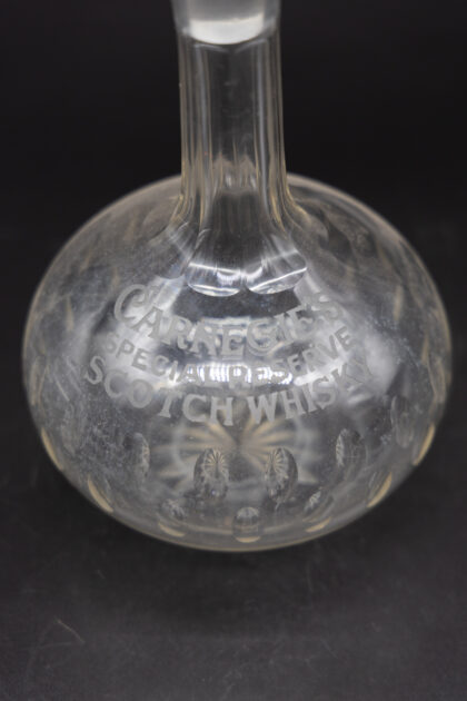 A glass decanter with lid and etched lettering for Carnegie's Special Reserve Scotch Whisky.