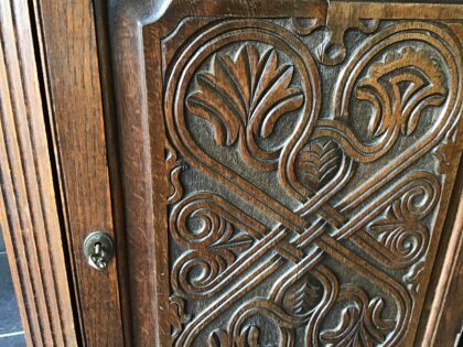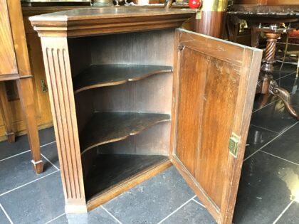 Solid wood corner unit with three shelves, working lock and key. Lovely carved panel detail on door. 76cm high, 40cm door to back corner, 73cm wide.