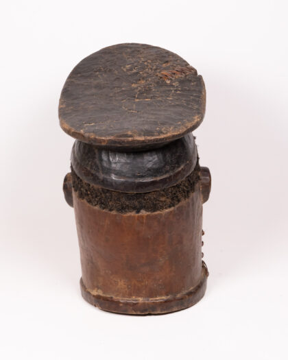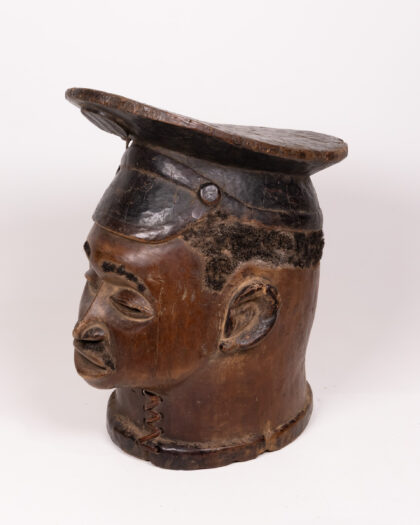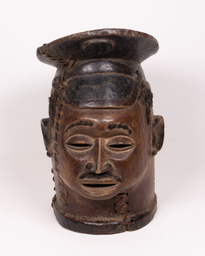 Discover this compelling vintage Makonde helmet mask, hand-carved from a single piece of wood in Tanzania. This culturally significant piece was traditionally used in initiation ceremonies to represent an ancestral spirit and convey important moral codes. The sculpture showcases remarkable attention to detail in its facial features and distinctive hat, reflecting the rich artistic heritage of the Makonde people. In good overall condition, this unique decorative object exhibits authentic age-related wear and a few small, stable cracks that contribute to its historical character and patina. An exceptional find for collectors of tribal art or those seeking a truly unique and meaningful accent for their home.