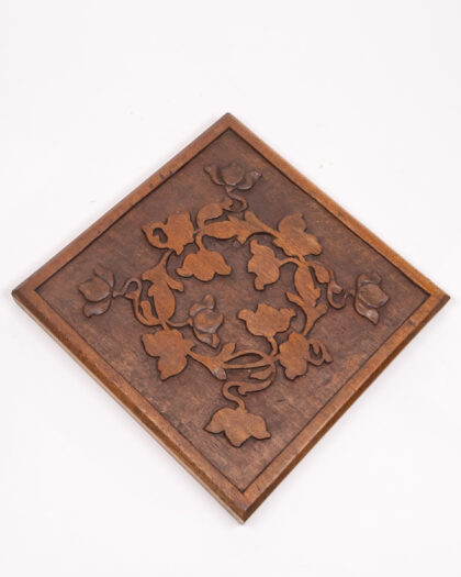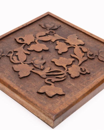 Square wooden wall plaque with intricately carved leaf and vine design. Warm brown finish. Ideal for adding a natural touch to any room.