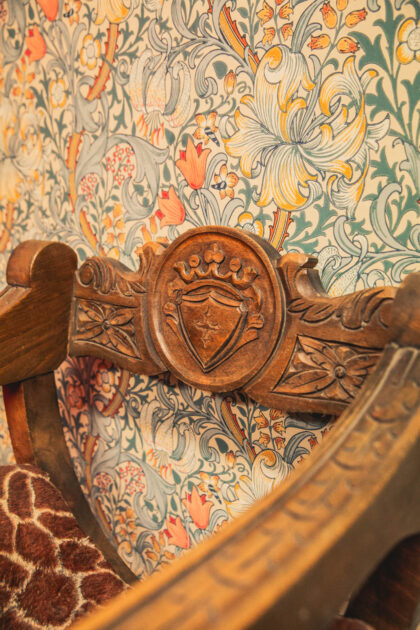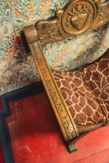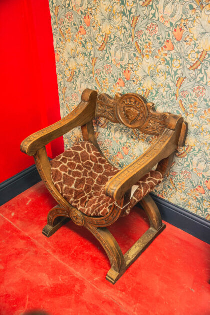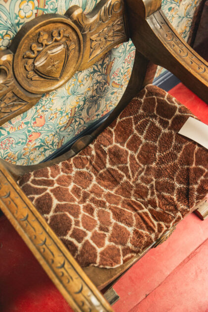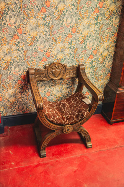 For the throne-room, lovely carved x-frame chair with giraffe print seat. Can be reupholstered.