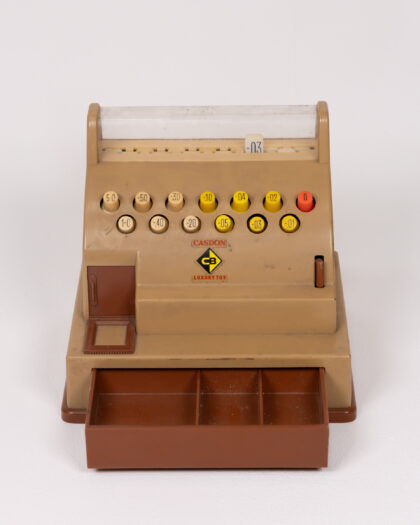 Vintage Casdon Luxury Toy cash register. A classic toy that is both fun and educational. Features include numbered buttons and a pull-out drawer. Made in England. In good vintage condition with some signs of age.
