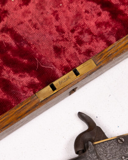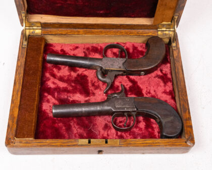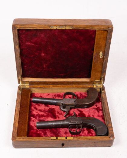 Antique cased pair of percussion cap pistols with engraved details, housed in a velvet-lined wooden case. Lombard Street, London. Collectible weapon.